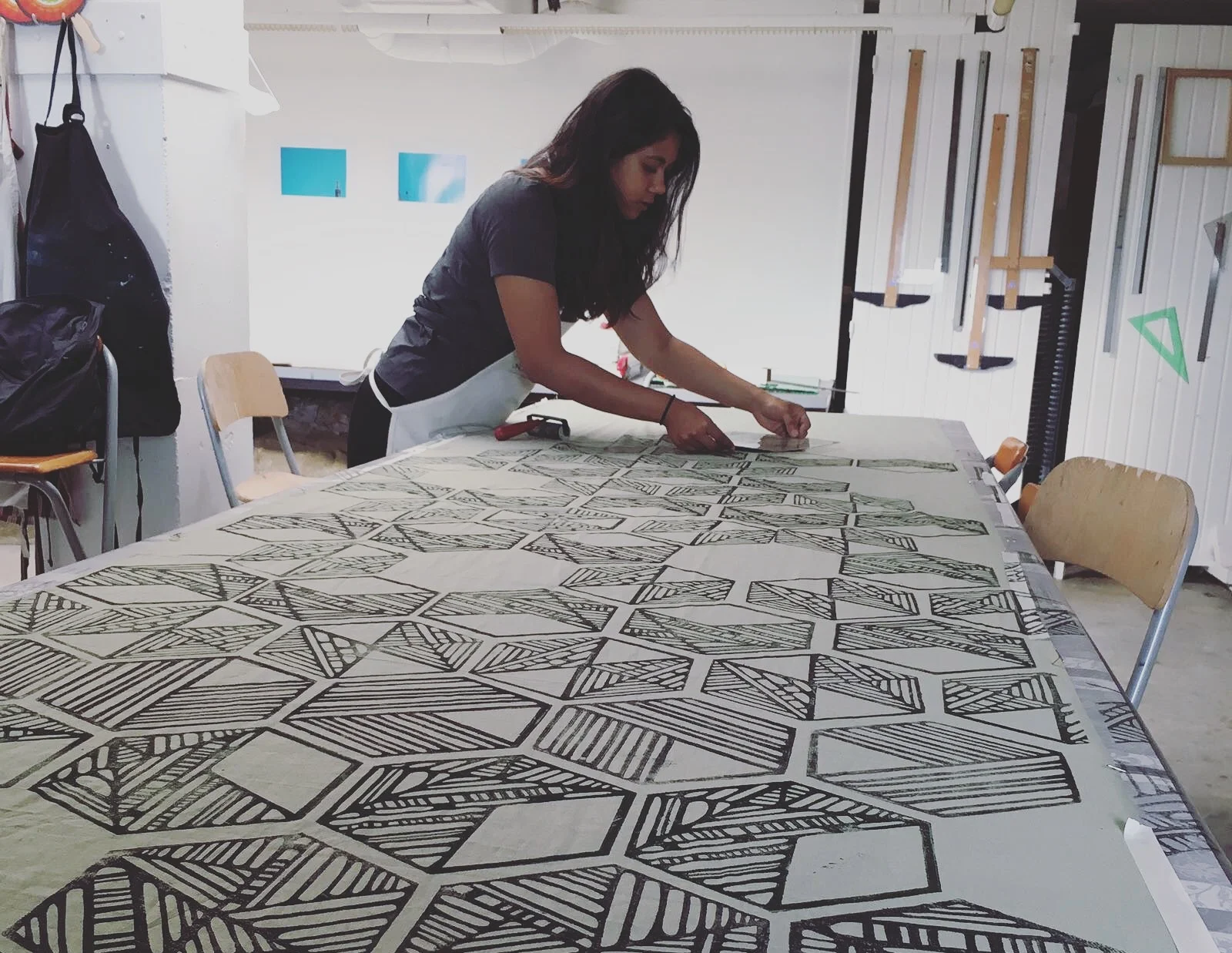 My project involved printing large-scale patterns on 18 yards of fabric using a combination of hand- and laser-cut blocks. The laser cutting process allowed me to manipulate both the positive and negative components of the image, thereby utilizing the entire block and not wasting any part. At the same time, I carved parts of the pattern by hand in order to add my own detailing and create a truly dialogic hand-and-machine process.
